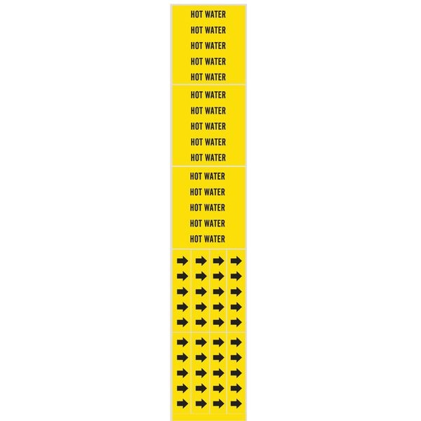 Pipe Marker, Pipe Marker Mounting Style Adhesive Pipe Marker, Pipe Marker Legend Hot Water, Legend Text Color Black, Character Height 1/2 in, Background Color Yellow, With or Without Arrows Without