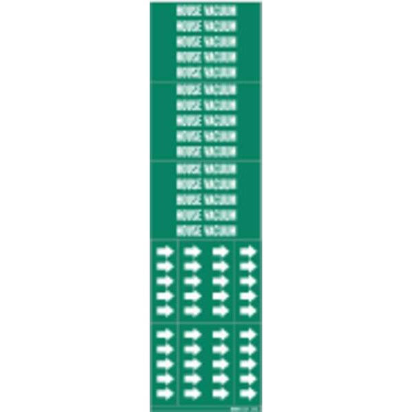 Pipe Marker, Pipe Marker Mounting Style Adhesive Pipe Marker, Pipe Marker Legend House Vacuum, Legend Text Color White, Character Height 1/2 in, Background Color Green, With or Without Arrows Without