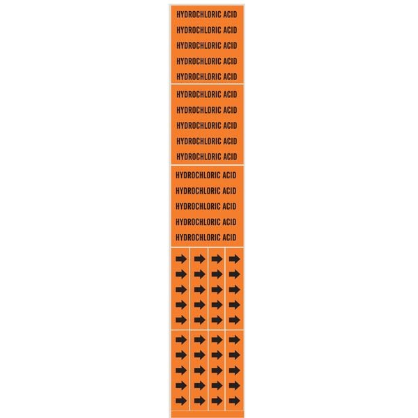 Pipe Marker, Pipe Marker Mounting Style Adhesive Pipe Marker, Pipe Marker Legend Hydrochloric Acid, Legend Text Color Black, Character Height 1/2 in, Background Color Orange, With or Without Arrows Without