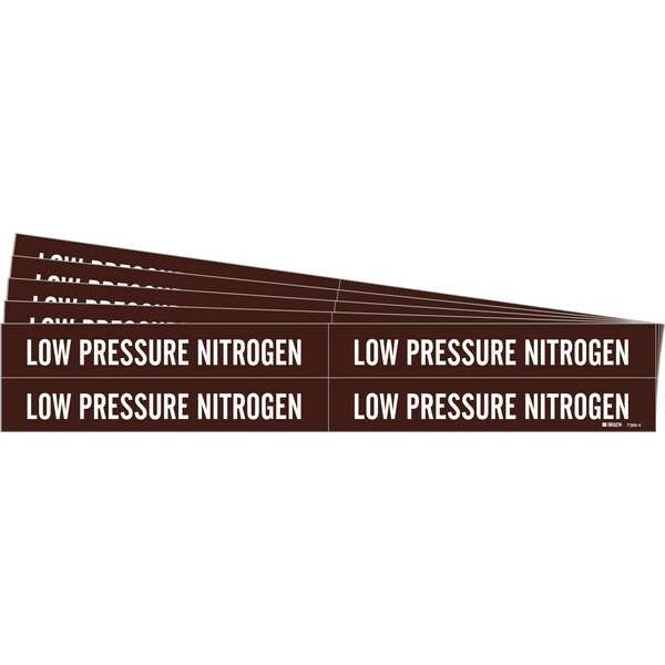 Pipe Marker, Pipe Marker Mounting Style Adhesive Pipe Marker, Pipe Marker Legend Low Pressure Nitrogen, Legend Text Color White, IIAR System Abbreviation Not Applicable, IIAR Phase Not Applicable, IIAR Pressure Level Not Applicable, Character Height 3/4 in, Background Color Brown, With or Without Arrows Without, Package Quantity 5