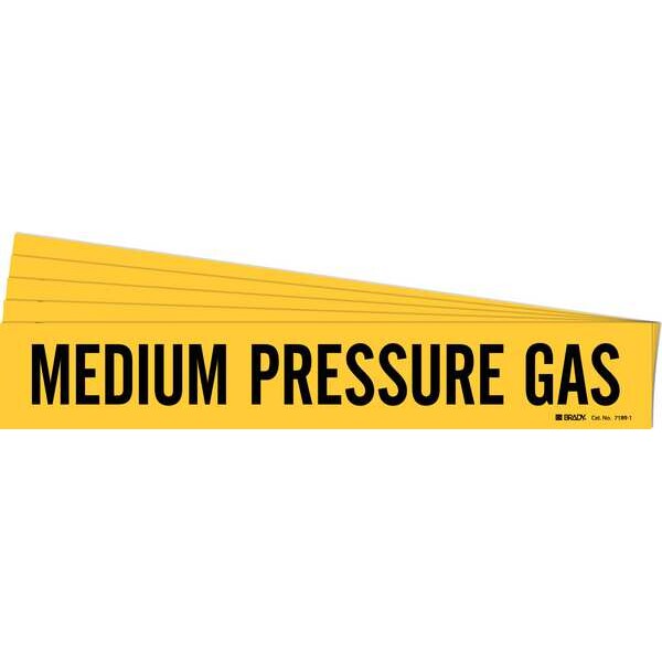 Pipe Marker, Pipe Marker Mounting Style Adhesive Pipe Marker, Pipe Marker Legend Medium Pressure Gas, Legend Text Color Black, IIAR System Abbreviation Not Applicable, IIAR Phase Not Applicable, IIAR Pressure Level Not Applicable, Character Height 2 in, Background Color Yellow, With or Without Arrows Without, Package Quantity 5