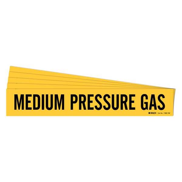 Pipe Marker, Pipe Marker Mounting Style Adhesive Pipe Marker, Pipe Marker Legend Medium Pressure Gas, Legend Text Color Black, IIAR System Abbreviation Not Applicable, IIAR Phase Not Applicable, IIAR Pressure Level Not Applicable, Character Height 3 1/2 in, Background Color Yellow, With or Without Arrows Without, Package Quantity 5