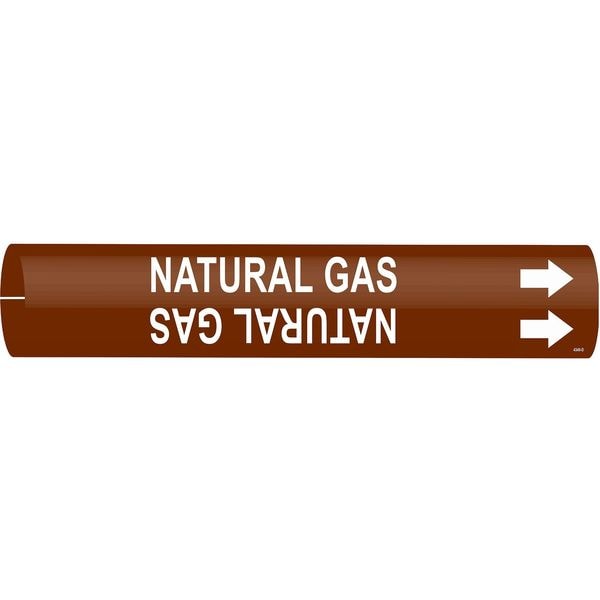 Pipe Marker, Pipe Marker Mounting Style Snap-On Pipe Marker, Pipe Marker Legend Natural Gas, Legend Text Color White, Character Height 1 1/4 in, Background Color Brown, With or Without Arrows With