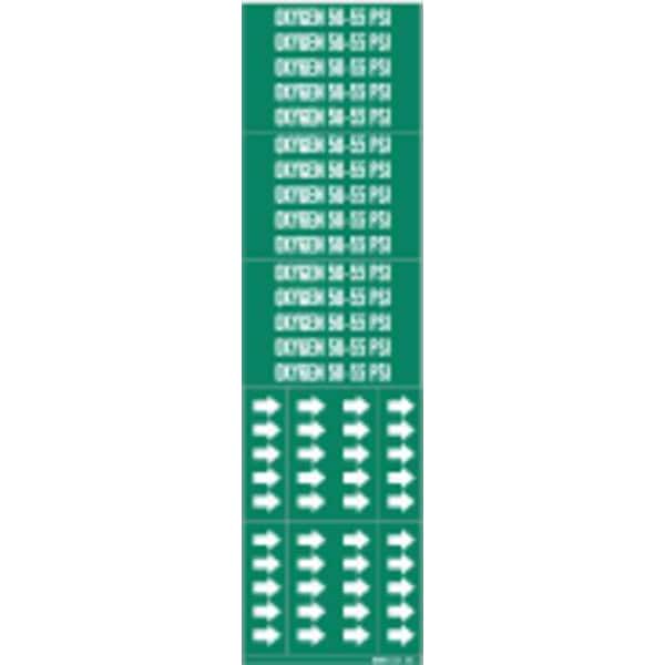 Pipe Marker, Pipe Marker Mounting Style Adhesive Pipe Marker, Pipe Marker Legend Oxygen 50-55 PSI, Legend Text Color White, Character Height 1/2 in, Background Color Green, With or Without Arrows With