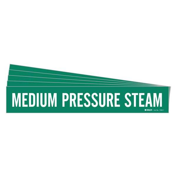 Pipe Marker, Pipe Marker Mounting Style Adhesive Pipe Marker, Pipe Marker Legend Medium Pressure Steam, Legend Text Color White, Character Height 2 in, Background Color Green, With or Without Arrows Without, Package Quantity 5