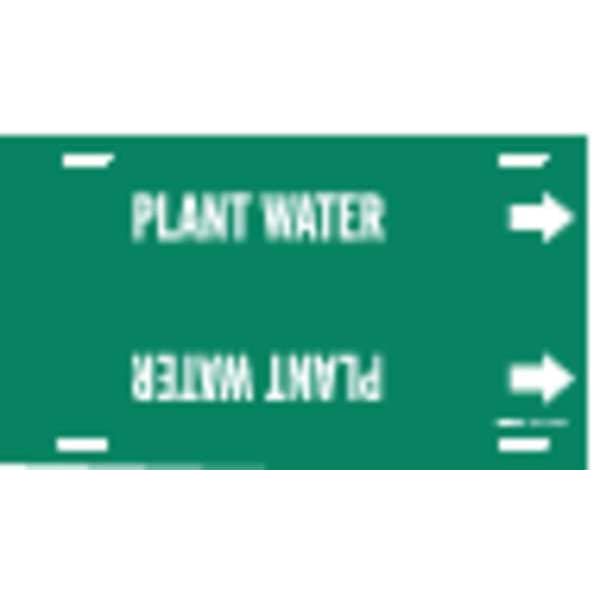 Pipe Marker, Pipe Marker Mounting Style Strap-On Pipe Marker, Pipe Marker Legend Plant Water, Legend Text Color White, Character Height 2 1/2 in, Background Color Green, With or Without Arrows With