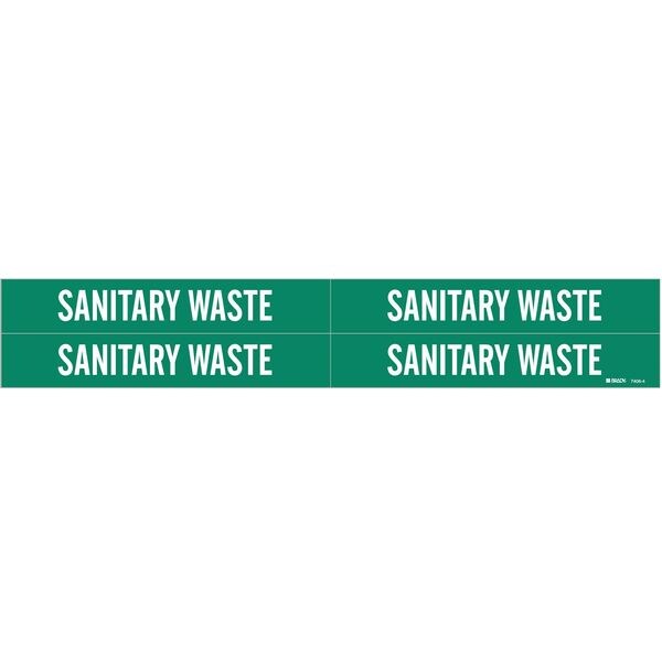 Pipe Marker, Pipe Marker Mounting Style Adhesive Pipe Marker, Pipe Marker Legend Sanitary Waste, Legend Text Color White, Character Height 3/4 in, Background Color Green, With or Without Arrows Without