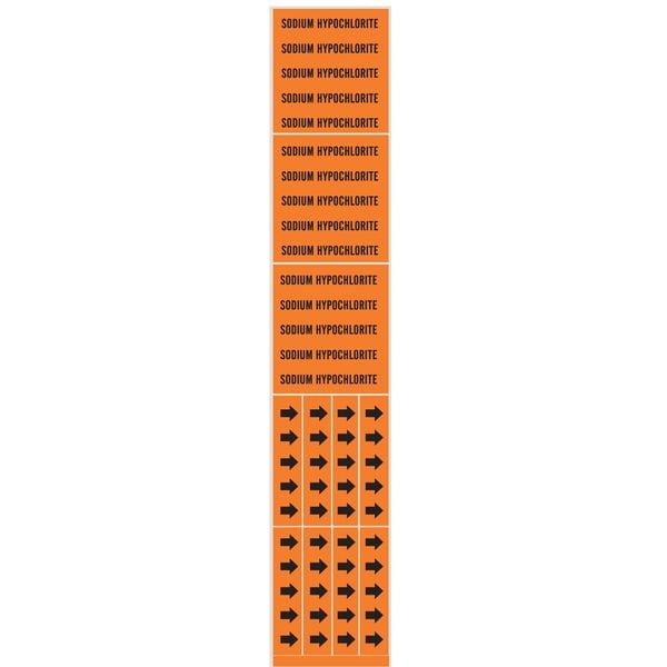 Pipe Marker, Pipe Marker Mounting Style Adhesive Pipe Marker, Pipe Marker Legend Sodium Hypochlorite, Legend Text Color Black, Character Height 1/2 in, Background Color Orange, With or Without Arrows Without