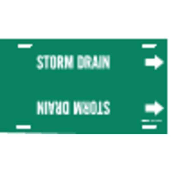 Pipe Marker, Pipe Marker Mounting Style Strap-On Pipe Marker, Pipe Marker Legend Storm Drain, Legend Text Color White, Character Height 3 1/2 in, Background Color Green, With or Without Arrows With