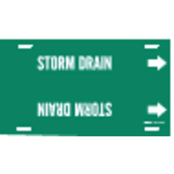 Pipe Marker, Pipe Marker Mounting Style Strap-On Pipe Marker, Pipe Marker Legend Storm Drain, Legend Text Color White, Character Height 1 1/4 in, Background Color Green, With or Without Arrows With