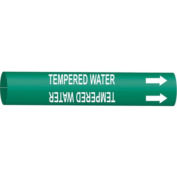 Pipe Marker, Pipe Marker Mounting Style Snap-On Pipe Marker, Pipe Marker Legend Tempered Water, Legend Text Color White, Character Height 2 1/2 in, Background Color Green, With or Without Arrows With