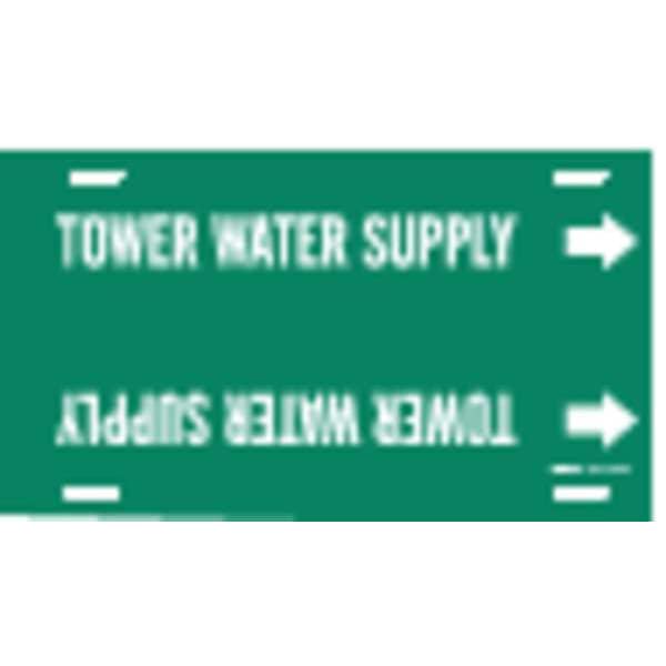 Pipe Marker, Pipe Marker Mounting Style Strap-On Pipe Marker, Pipe Marker Legend Tower Water Supply, Legend Text Color White, Character Height 3 1/2 in, Background Color Green, With or Without Arrows With
