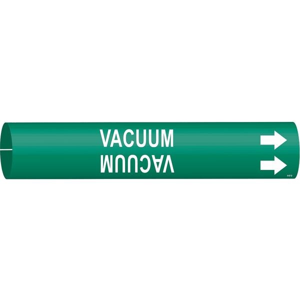 Pipe Marker, Pipe Marker Mounting Style Snap-On Pipe Marker, Pipe Marker Legend Vacuum, Legend Text Color White, Character Height 1 1/4 in, Background Color Green, With or Without Arrows With