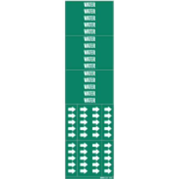 Pipe Marker, Pipe Marker Mounting Style Adhesive Pipe Marker, Pipe Marker Legend Water, Legend Text Color White, Character Height 1/2 in, Background Color Green, With or Without Arrows Without
