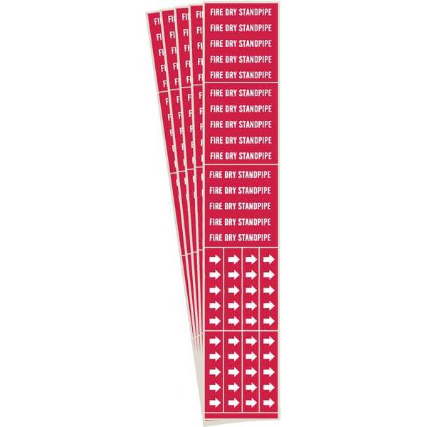 Pipe Marker, Pipe Marker Mounting Style Adhesive Pipe Marker, Pipe Marker Legend Fire Dry Standpipe, Legend Text Color White, IIAR System Abbreviation Not Applicable, IIAR Phase Not Applicable, IIAR Pressure Level Not Applicable, Character Height 1/2 in, Background Color Red, With or Without Arrows With, Package Quantity 5