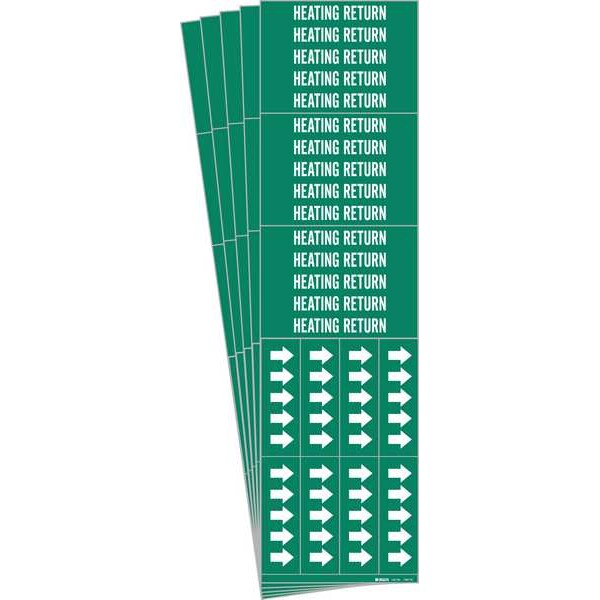 Pipe Marker, Pipe Marker Mounting Style Adhesive Pipe Marker, Pipe Marker Legend Heating Return, Legend Text Color White, IIAR System Abbreviation Not Applicable, IIAR Phase Not Applicable, IIAR Pressure Level Not Applicable, Character Height 1/2 in, Background Color Green, With or Without Arrows With, Package Quantity 5
