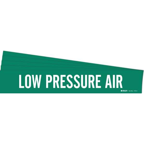 Pipe Marker, Pipe Marker Mounting Style Adhesive Pipe Marker, Pipe Marker Legend Low Pressure Air, Legend Text Color White, IIAR System Abbreviation Not Applicable, IIAR Phase Not Applicable, IIAR Pressure Level Not Applicable, Character Height 2 in, Background Color Green, With or Without Arrows Without, Package Quantity 5