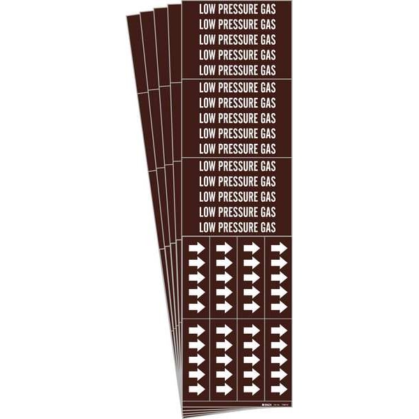 Pipe Marker, Pipe Marker Mounting Style Adhesive Pipe Marker, Pipe Marker Legend Low Pressure Gas, Legend Text Color White, IIAR System Abbreviation Not Applicable, IIAR Phase Not Applicable, IIAR Pressure Level Not Applicable, Character Height 1/2 in, Background Color Brown, With or Without Arrows With, Package Quantity 5