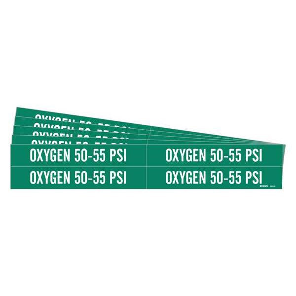 Pipe Marker, Pipe Marker Mounting Style Adhesive Pipe Marker, Pipe Marker Legend Oxygen 50-55 PSI, Legend Text Color White, IIAR System Abbreviation Not Applicable, IIAR Phase Not Applicable, IIAR Pressure Level Not Applicable, Background Color Green, With or Without Arrows Without, Package Quantity 5