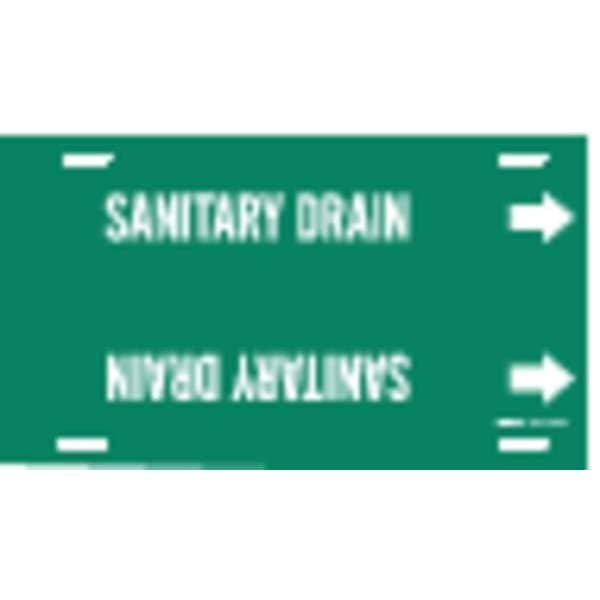 Pipe Marker, Pipe Marker Mounting Style Strap-On Pipe Marker, Pipe Marker Legend Sanitary Drain, Legend Text Color White, Character Height 2 1/2 in, Background Color Green, With or Without Arrows With