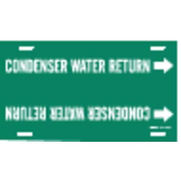 Pipe Marker, Pipe Marker Mounting Style Strap-On Pipe Marker, Pipe Marker Legend Condenser Water Return, Legend Text Color White, Character Height 2 1/2 in, Background Color Green, With or Without Arrows With