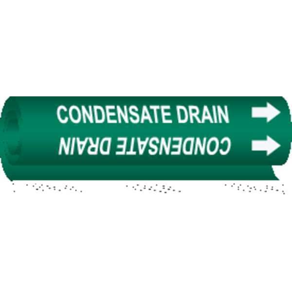 Pipe Marker, Pipe Marker Mounting Style Wrap-Around Pipe Marker, Pipe Marker Legend Condensate Drain, Legend Text Color White, Character Height 1/2 in, Background Color Green, With or Without Arrows With
