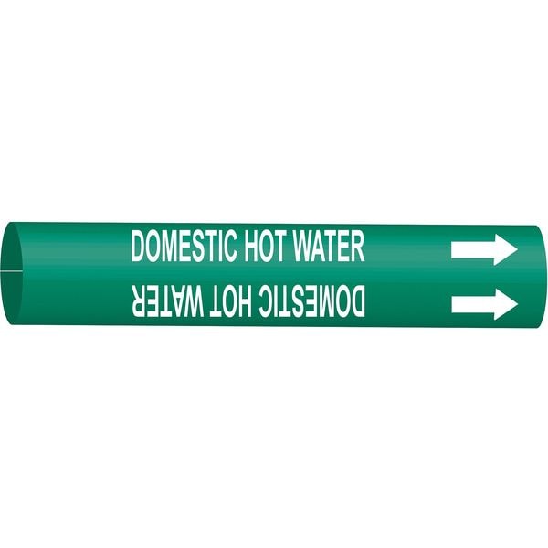 Pipe Marker, Pipe Marker Mounting Style Strap-On Pipe Marker, Pipe Marker Legend Domestic Hot Water, Legend Text Color White, Character Height 2 1/2 in, Background Color Green, With or Without Arrows With