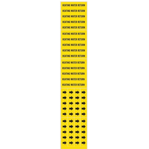 Pipe Marker, Pipe Marker Mounting Style Adhesive Pipe Marker, Pipe Marker Legend Heating Water Return, Legend Text Color Black, Character Height 1/2 in, Background Color Yellow, With or Without Arrows Without