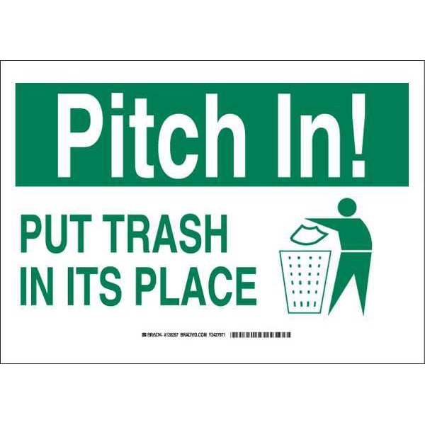 Facility Sign, Sign Subject Matter Cleaning and Maintenance, Height 10 In., Width 14 In., Sign Material Polyester, Sign Mounting Style Adhesive Surface, Header Pitch In, Legend Pitch In Put Trash In Its Place, Printed Language English, Sign Shape Rectangle
