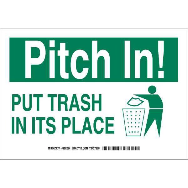 Facility Sign, Sign Subject Matter Cleaning and Maintenance, Height 7 In., Width 10 In., Sign Material Polyester, Sign Mounting Style Adhesive Surface, Header Pitch In, Legend Put Trash In Its Place, Printed Language English, Sign Shape Rectangle