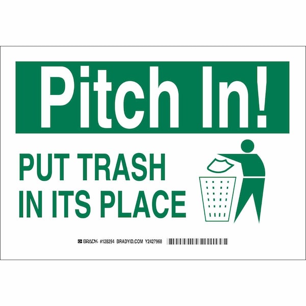 Facility Sign, Sign Subject Matter Cleaning and Maintenance, Height 10 In., Width 14 In., Sign Material Plastic, Sign Mounting Style With Mounting Holes, Header Pitch In, Legend Put Trash In Its Place, Printed Language English, Sign Shape Rectangle