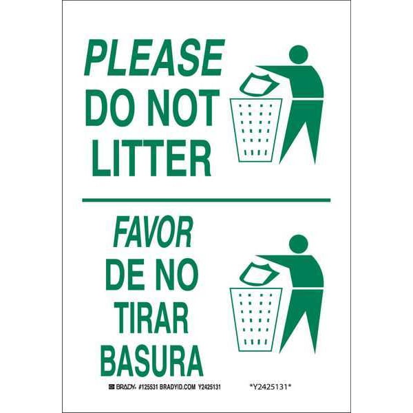 Facility Sign, Sign Subject Matter Cleaning and Maintenance, Height 10 In., Width 7 In., Sign Material Plastic, Sign Mounting Style With Mounting Holes, Header No Header, Legend Please Do Not Litter/Favor De No Tirar Basura, Printed Language English, Spanish, Sign Shape Rectangle