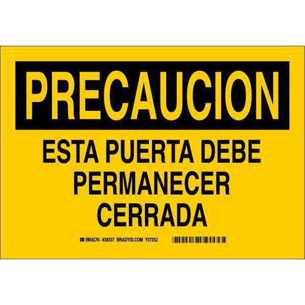 Safety Sign, Sign Subject Matter Door Instruction, Height 10 In., Width 14 In., Sign Material Aluminum, Header Precaucion, Legend Esta Puerta Debe Permanecer Cerrada, Printed Language Spanish, Sign Shape Rectangle