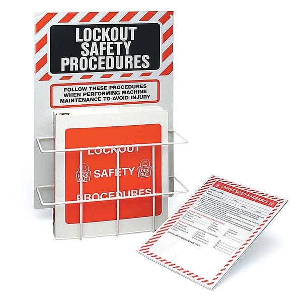 Binder, Binder Holder Material Steel, Binder Material Not Applicable, Binder Ring Size Not Applicable, Included Supplemental Materials Not Applicable, Language English, Mounting Hardware Included Yes, Mounting Style Wall-Mount, Number of Binder Holders 1, Number of Binders Included 1, Overall Depth 4 1/2 in, Overall Height 20 in, Overall Width 14 in, Preprinted Text Lockout Safety Procedures, Product Type Binder, Station Color Red, White, Subject Matter Binder Holder, Safety Data Sheets