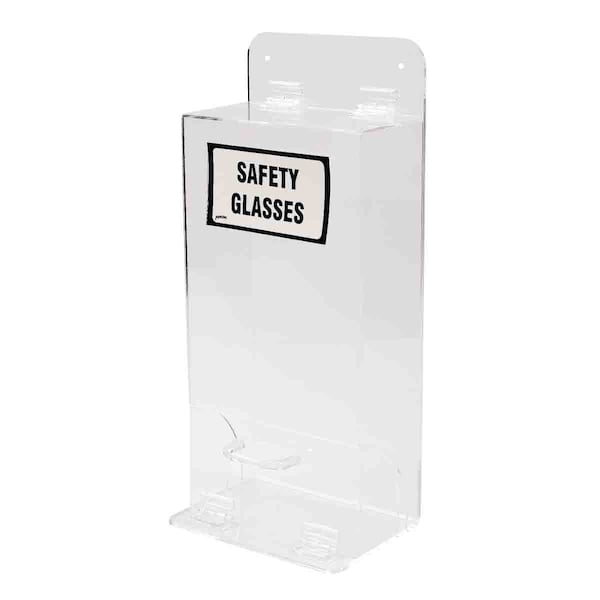 Protective Eyewear Dispenser, Capacity 20 Pairs, Color Clear, Dispenser Contains Glasses, Dispenser Features Bottom Door, Dispenser Layout 1 Compartment, Dispenser Style Stack Tower, Dispensing Method Hinged Lid, Material Acrylic, Message Safety Glasses, Mounting Location Wall, Number of Compartments 1, Overall Depth 4 in, Overall Height 18 in, Overall Width 8 in