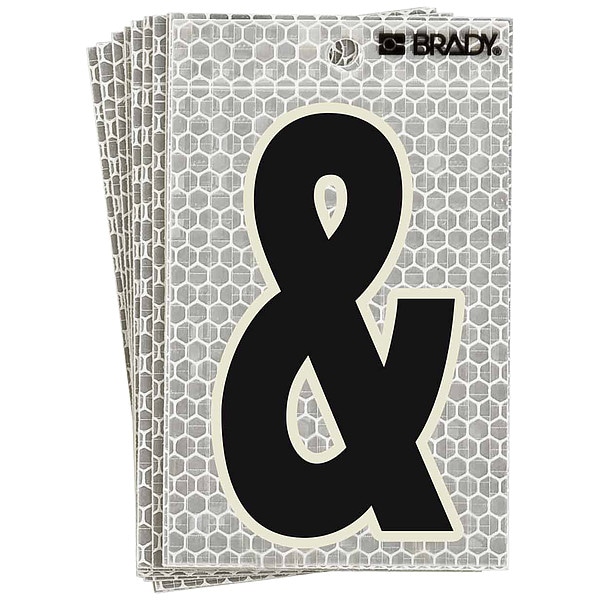 Punctuation Label, Adhesive Type Permanent Adhesive, Application General Identification, APWA Compliant Color No, Background Color Silver, Character Color Black, Character Color Gradient Solid Color, Character Height 5 in, Character Outline Color Not Applicable, Character Type Punctuation, Characters Included Ampersand (&), Die Cut Yes, Embossed No, Font Archivo Narrow, Includes (10) Cards, Indoor/Outdoor Usage Indoor/Outdoor, Letter Casing Uppercase, Material Retroreflective Sheeting