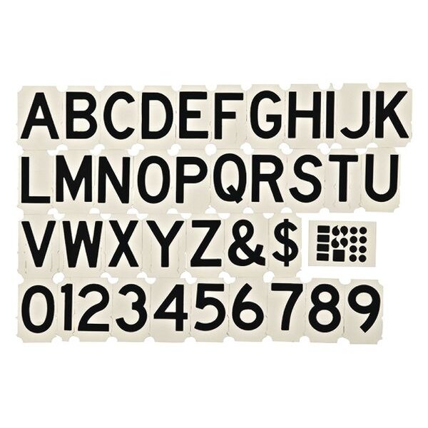 Quik Align Kit, Adhesive Type Permanent Adhesive, Application General Identification, APWA Compliant Color No, Background Color White, Character Color Black, Character Color Gradient Solid Color, Character Height 3 in, Character Outline Color Not Applicable, Character Type Letters/Numbers/Punctuation, Characters Included 0 to 9/A to Z/Punctuation, Die Cut Yes, Embossed No, Font Gothic, Includes (10) Markers Of The Remaining Letters, (20) Markers A, E, I, L, N, O, R, S, T, 0 to 9