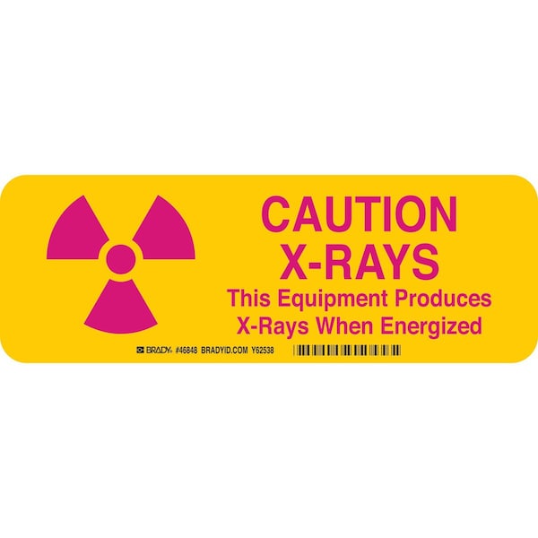 Radiation Caution Sign, Sign Subject Matter Radiation and X-Ray, Height 3 1/2 in, Width 10 in, Sign Material Aluminum, Sign Mounting Style With Mounting Holes, Header No Header, Legend Caution X-Rays This Equipment Produces X-Rays When Energized, Printed Language English, Sign Shape Rectangle