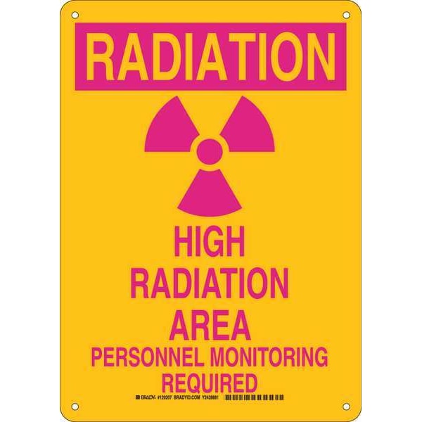 Hazard Sign, Sign Subject Matter Radiation and X-Ray, Height 14 in, Width 10 in, Sign Material Aluminum, Sign Mounting Style With Mounting Holes, Header Radiation, Legend High Radiation Area Personnel Monitoring Required, Printed Language English, Sign Shape Rectangle
