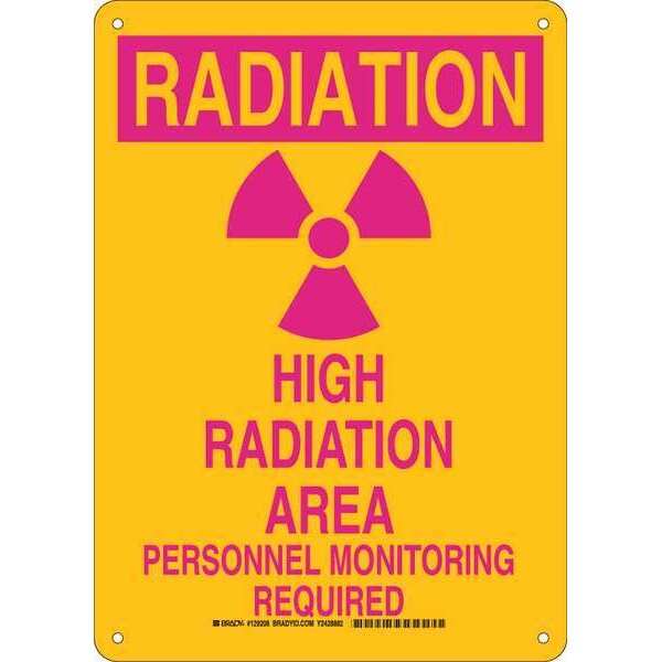 Hazard Sign, Sign Subject Matter Radiation and X-Ray, Height 14 in, Width 10 in, Sign Material Plastic, Sign Mounting Style With Mounting Holes, Header Radiation, Legend High Radiation Area Personnel Monitoring Required, Printed Language English, Sign Shape Rectangle