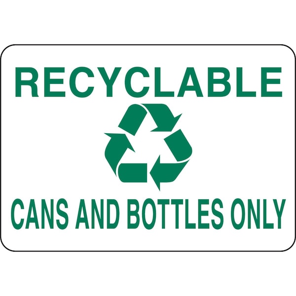 Recycling Sign, Sign Subject Matter Recycling, Height 7 In., Width 10 In., Sign Material Plastic, Sign Mounting Style With Mounting Holes, Header No Header, Legend Recyclable Cans And Bottles Only, Printed Language English, Sign Shape Rectangle