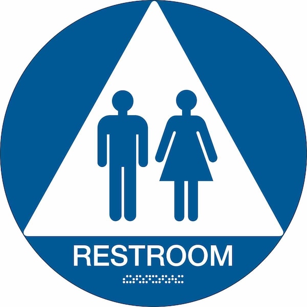 Restroom Sign, Sign Subject Matter Restrooms, Height 12 In., Width 12 In., Sign Material Plastic, Sign Mounting Style Surface, Header No Header, Legend Restroom, Printed Language Braille, English, Sign Shape Circle