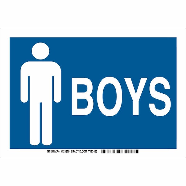 Restroom Sign, Sign Subject Matter Restrooms, Height 7 In., Width 10 In., Sign Material Polyester, Sign Mounting Style Adhesive Surface, Header No Header, Legend Boys, Printed Language English, Sign Shape Rectangle