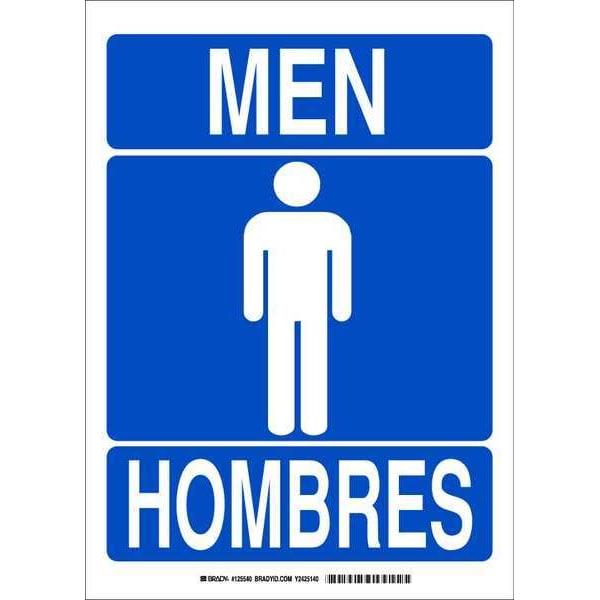 Restroom Sign, Sign Subject Matter Restrooms, Height 14 in, Width 10 in, Sign Material Polyester, Sign Mounting Style Adhesive Surface, Header No Header, Legend Men/Hombres, Printed Language English, Spanish, Sign Shape Rectangle