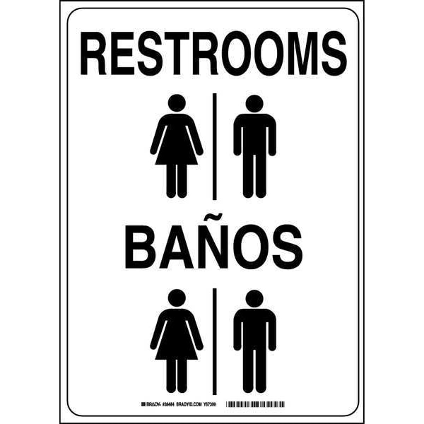 Safety Sign, Sign Subject Matter Restrooms, Height 14 In., Width 10 In., Sign Material Aluminum, Sign Mounting Style With Mounting Holes, Header No Header, Legend Restrooms/Banos, Printed Language English, Spanish, Sign Shape Rectangle