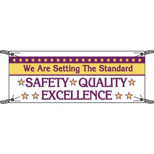 Safety Banner, Shape Horizontal Rectangle, Safety Banner Legend Safety Quality Excellence, Sign Legend Style Symbol and Text, Printed Language English, Background Color Purple, White, Yellow, Number of Printed Sides 1, Width 120 in, Height 48 in, Thickness 0.055 in
