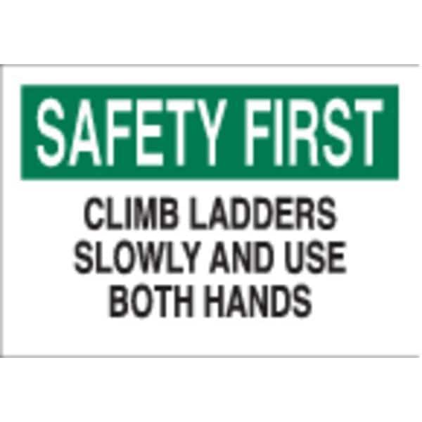 Safety Reminder Sign, Sign Subject Matter Accident Prevention, Height 7 In., Width 10 In., Sign Material Polyester, Sign Mounting Style Adhesive Surface, Header Safety First, Legend Climb Ladders Slowly And Use Both Hands, Printed Language English, Sign Shape Rectangle
