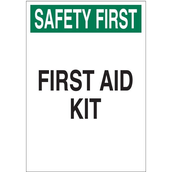 First Aid Sign, Sign Subject Matter First Aid, Height 14 In., Width 10 In., Sign Material Polyester, Sign Mounting Style Adhesive Surface, Header Safety First, Legend First Aid Kit, Printed Language English, Sign Shape Rectangle