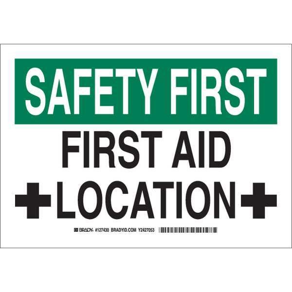 First Aid Sign, Sign Subject Matter First Aid, Height 10 In., Width 14 In., Sign Material Polyester, Sign Mounting Style Adhesive Surface, Header Safety First, Legend First Aid Location, Printed Language English, Sign Shape Rectangle