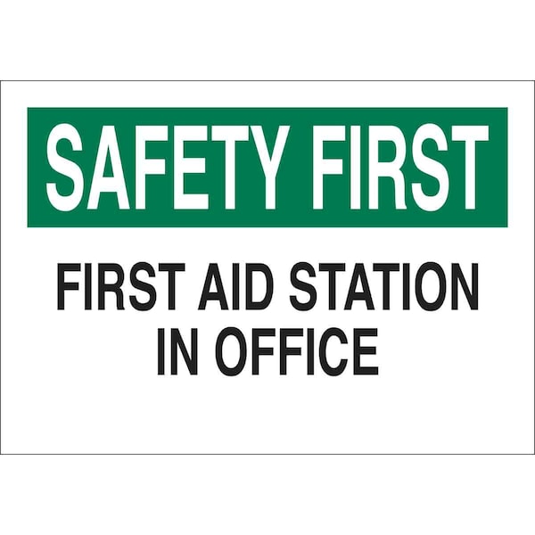 First Aid Sign, Sign Subject Matter First Aid, Height 7 In., Width 10 In., Sign Material Plastic, Sign Mounting Style With Mounting Holes, Header Safety First, Legend First Aid Station In Office, Printed Language English, Sign Shape Rectangle